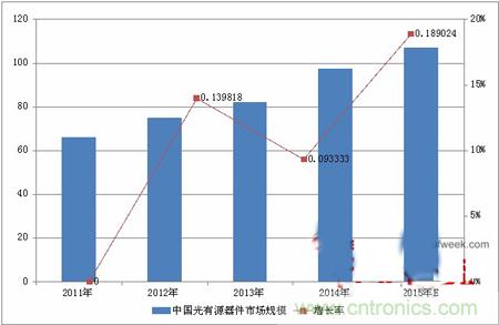 據(jù)OFweek行業(yè)研究中心出版的《2015-2018年中國光有源器件市場(chǎng)分析及前景預(yù)測(cè)報(bào)告》顯示,2011年-2014年中國光有源器件市場(chǎng)規(guī)模增長較快,年復(fù)合增長率達(dá)到14%。未來幾年會(huì)有所放緩,年復(fù)合增長率會(huì)降至10%左右。2014年中國光有源器件市場(chǎng)規(guī)模為97.5億元人民幣,估計(jì)2015年將達(dá)到107億元。