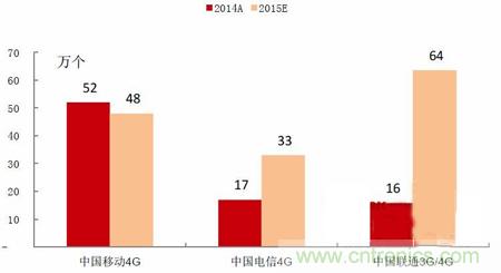 圖表3 2014、2015年三大運(yùn)營商新增4G基站數(shù)量(單位:萬個(gè))