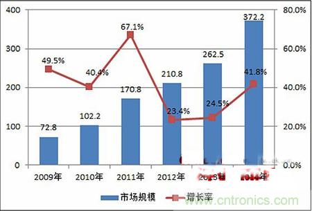 圖表5 2009-2014年中國IDC行業(yè)市場(chǎng)規(guī)模及增長(單位:億元,%)
