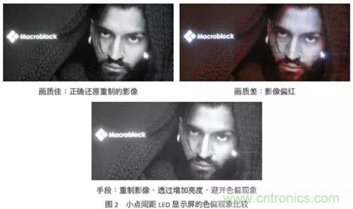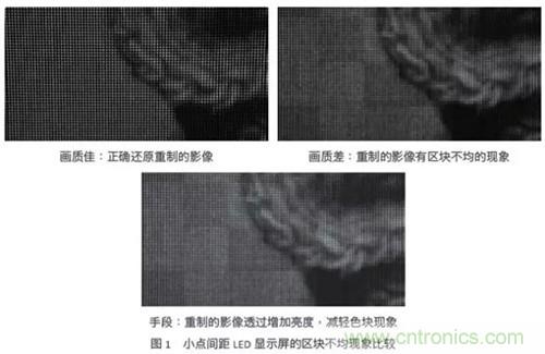 在室內應用中,LED顯示屏的亮度多介于300到1000尼特(nit),將此亮度轉換成LED順向電流,約當于1~5mA,甚至小于1mA。因此,驅動芯片的小電流集中度變得很重要。當驅動芯片電流精度不佳,小點間距LED顯示屏就容易出現區塊不均的色塊,然而為掩飾色塊這個缺陷,通常會采取提高LED電流這個手段,來增加顯示屏的亮度。但帶來的缺點是,當觀眾注視這個LED顯示屏一段時間后,眼睛容易感覺不適。圖1所演示的是小點間距LED顯示屏,在使用不同質量的LED驅動芯片時,重制圖像后的實際差異。