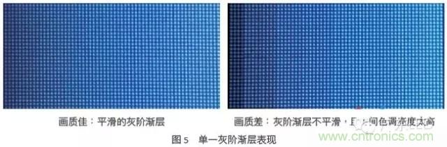 小點間距LED顯示屏為時序掃描式(multiplexed)的顯示器,非液晶屏幕的hold-type顯示器,所以刷新率對于小點間距LED顯示屏來說相當地重要,較低的刷新率不僅會使小點間距LED顯示屏觀賞起來有閃爍的不適感,容易使造成觀賞者暈炫,而且會使灰階漸層的效果不平滑。以圖4為例,右圖臉部的灰階漸層效果較左圖的不平滑,有類似等高線的現象,從圖5的灰階漸層測試畫面也可以看出右圖的小點間距LED顯示屏的連續性比左圖的差。