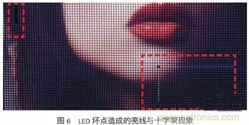 現今的LED磊晶與封裝技術與日俱增,但LED經過長時間的使用后仍難免會有損壞,與液晶屏幕不同的是,壞掉的LED會在小點間距LED顯示屏形成亮線或是十字架,而不是一個黑點,如圖6所示。對LED顯示屏制造商,營運商與觀眾而言,都是一大困擾。