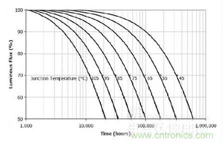 我們知道LED的壽命完全是由它的結溫決定的,美國Cree公司就給出了結溫和壽命的曲線。