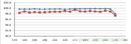 圖中的藍色為恒流源本身的效率,紅色為包括了整流器在內的全部電源的效率。由圖中可見當市電電壓從175V增加到265V時,它的效率一直保持在99%以上。這樣高效率的恒流源,放到鋁基板上以后就基本上不會增加鋁基板的熱量,也就不會降低光引擎的熱光效,更不會降低光引擎的壽命了!此外它的效率也不隨溫度而變化:
