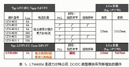 爾特公司推出的最新 DC/DC 微型模塊(µModuleTM)穩壓器,LTM4604 也引出了一個面向低壓應用(2.375V 至 5V)的新器件系列。第一個器件系列由 6 個 DC/DC 微型模塊穩壓器組成,以較高電壓和較高功率的應用為目標,而新推出的器件系列專門用于較低電壓和功率略低一些的應用。此外,新器件系列采用的封裝小 40%。參見表 1,以迅速了解這些緊湊和完整的 DC/DC 系統的特色。