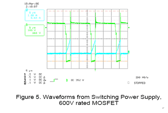 但這里必須提醒一件事 , 圖四所標(biāo)示的 BVDSS 是基于 250uA 的 ID 電流為條件所定義。在實(shí)際崩潰發(fā)生時(shí) ID 電流遠(yuǎn)大于 uA 的范圍。 因此 , 所欲達(dá)到的崩潰電壓也會(huì)比上述圖四中所推導(dǎo)的電壓要來(lái)的大的多。就實(shí)際的考量而言 , 場(chǎng)效應(yīng)晶體管的實(shí)際崩潰電壓一般是額定低電流崩潰電壓的 1.3 倍。以圖五為例 , 它所表示的是一個(gè)超過最大額定電壓但并未進(jìn)入崩潰現(xiàn)象的波形 ,Drain-Source 的電壓已達(dá)到 668V > 600V 但并未嵌制于崩潰效應(yīng)。
