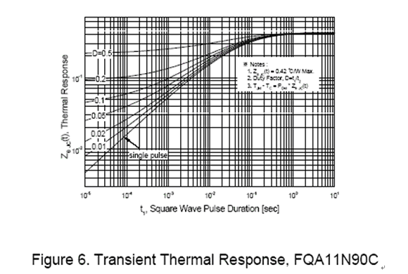 舉例說(shuō)明 , 當(dāng)一個(gè) 2KW 的電源脈沖加至 FQA11N90 的脈沖時(shí)間為 1uS 時(shí) , 我們可依據(jù)圖六的曲線算出此脈沖功率對(duì)接合面所產(chǎn)生的溫升為