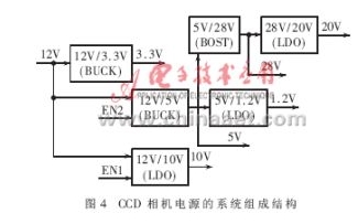 CCD 相機中的圖像信息的流動和變換是通過相機中的FPGA/CPLD時序發(fā)生器的驅(qū)動和MCU的控制管理下完成的。整個CCD相機正常工作需要以下6種穩(wěn)壓電源,它們的電壓值和最大輸出電流分別是:28V@30mA、20V@50mA、10V@100mA、5V@20mA、3.3V@300mA和1.2V@30mA。
