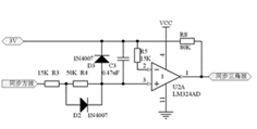 在如圖3所示的同步方波發(fā)生電路中,將工頻電壓同步取樣信號通過電阻 R7 加在運算放大器I3的反相輸入端,與同相輸入端的+3V參考電壓進行過零比較,那么運算放大器的輸出端將得到脈沖寬度符合設(shè)計要求的方波電壓。