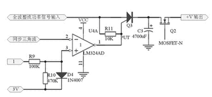 圖5所示的電路中,延時比較開關(guān)由運算放大器U4A組成。同步三角波輸入到運算放大器U4A的反相輸入端,差壓比較兼積分濾波電路的輸出電壓加到運算放大器U4A的同相輸入端進行比較、整形。