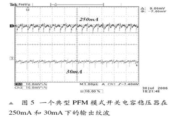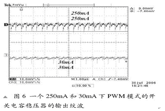 比較新的PWM調(diào)控模式處理了PFM架構(gòu)中的各種頻率和高輸出紋波。大多數(shù)的新型開(kāi)關(guān)電容穩(wěn)壓器都采用PWM調(diào)制模式。在這種模式下,功率FET的電阻根據(jù)VOUT 和 ILOAD進(jìn)行控制。這樣做,我們就真正控制了快速電容器(CFLY)所提供的充電量。這也被稱(chēng)為預(yù)調(diào)制。在這種模式下,操作頻率和工作周期都是固定的。一個(gè)PWM架構(gòu)的例子是LM2771,圖6顯示出它的輸出紋波。它處于一個(gè)帶有4.7mF COUT 的8mV -10mV的順序中。我們可以看到在ILOAD變化的情況下紋波可以持續(xù)。一個(gè)9mV的紋波輸出可以與在感應(yīng)開(kāi)關(guān)穩(wěn)壓器中的紋波相媲美。