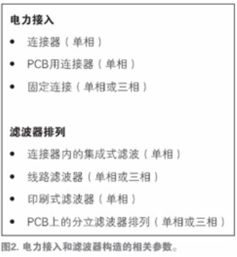在電力接入和濾波器構(gòu)造這兩方面之間(圖2),關(guān)于濾波器的構(gòu)造方式(例如與內(nèi)置濾波器的固定連接、帶有集成式線路濾波器的電力進(jìn)入模塊、PCB上與分立濾波器的固定連接等),大約有10個(gè)有意義的組合。