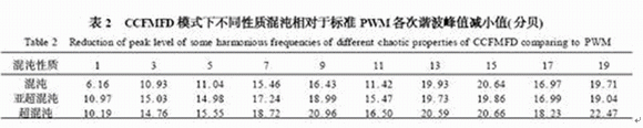 從表中給出的以標(biāo)準(zhǔn)周期PWM前19次諧波為參照的數(shù)據(jù)可以看出,分別在混沌、亞超混沌及超混沌信號調(diào)制下,各次諧波對應(yīng)處的頻譜數(shù)值都得到了明顯的降低。在混沌信號調(diào)制下,諧波對應(yīng)處的頻譜數(shù)值平均降低14.87分貝(dB);在亞超混沌信號調(diào)制下,諧波對應(yīng)處的頻譜數(shù)值平均降低16.84分貝(dB);在超混沌信號調(diào)制下,諧波對應(yīng)處的頻譜數(shù)值平均降低17.86分貝(dB)。若以歐盟(89/336/EEC指令)電磁兼容性導(dǎo)則中限制設(shè)備輸入電流諧波分量最大值幅度這一原則,來討論不同性質(zhì)混沌信號降低電磁干擾水平的效果,結(jié)論非常明顯,即以超混沌信號作為開關(guān)調(diào)制信號源,比混沌能更好地降低電磁干擾水平。