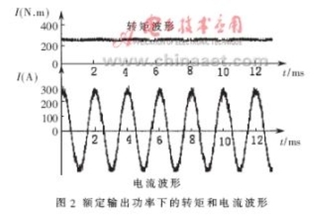 電機額定功率為57kW,額定轉矩為270N•m,額定轉速為2000r/min,額定端電壓為230V。變頻器系統參數根據使用的電機進行匹配。在額定功率下運行時的轉矩和電流波形如圖2所示。