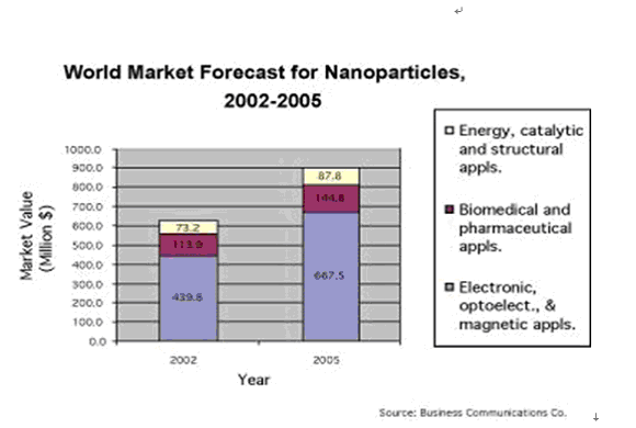納米科技是21世紀(jì)科技發(fā)展的重要技術(shù)領(lǐng)域,藉由納米科技將創(chuàng)造另一波技術(shù)創(chuàng)新及產(chǎn)業(yè)革命。近年來歐美日各國均投入大量人力與經(jīng)費,進(jìn)行納米材料與應(yīng)用技術(shù)的開發(fā)。納米材料應(yīng)用的范圍甚廣,包含化工、民生、消費性電子、光學(xué)、生物、制藥、能源等產(chǎn)業(yè)的應(yīng)用。根據(jù)美國市調(diào)機(jī)構(gòu)Business Communication之調(diào)查分析結(jié)果,納米材料在整體產(chǎn)業(yè)的應(yīng)用上,于2005年市場需求值可達(dá)9億美元,如(圖一)。諾貝爾獎得主Dr. Smalley表示,未來五十年人類面臨十大問題中,以能源居首,能源需求量成長了3~4倍,而納米技術(shù)將可帶動納米能源的革命性發(fā)展與突破,包括納米鋰電池、太陽能電池、燃料電池、儲氫系統(tǒng)、光觸媒、光電池等等應(yīng)用。