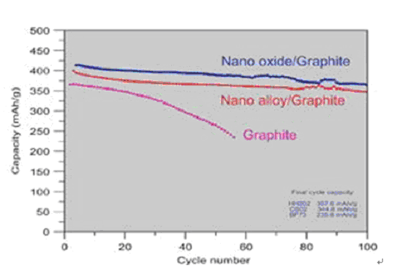 目前商品化的鋰電池負(fù)極材料,主要種類包括石墨化碳、人工石墨、硬碳及碳纖維等。其中石墨化碳(如介穩(wěn)定相碳狀碳)的市場佔有率最高約30%,其材料價格高(每公斤30~32美金)、容量適中、壽命佳,目前被大量使用于鋰電池負(fù)極材料;然而其容量已達(dá)技術(shù)極限,非得使用更高容量的石墨碳材或合金材料,才能獲得高能量密度的鋰電池。目前高容量負(fù)極材料的開發(fā),主要包括利用高能量機(jī)械合金化研磨(high-energy mechanical alloying) 技術(shù),將金屬或合金材料進(jìn)行高能量研磨,以獲得納米結(jié)構(gòu)金屬或合金材料;或?qū)⑻挤郾砻驽兩弦粚蛹{米氧化物及合金材料,以形成納米復(fù)合負(fù)極材料,如(圖三)。