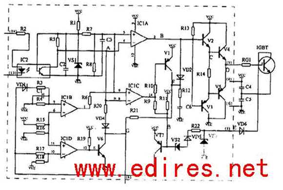 在M57962L輸入端13和14無(wú)電流時(shí),IC1截止,A點(diǎn)電位上升使IC2A的2腳變?yōu)榈碗娢唬瑒t使V3、V5導(dǎo)通,V2、V4截止。lGBT的門極(GATE)通過(guò)V5導(dǎo)通到VEE,而使IGBT關(guān)斷。IC2C的14腳輸出為低電平, 使V1、V7導(dǎo)通, 使IC2B、IC2D保持原先狀態(tài)不變。