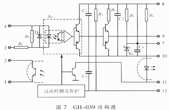 其內(nèi)部結(jié)構(gòu)圖如圖7所示,工作原理與EXB和M57系列模塊相類似,這里不再贅述。而與EXB系列和M57系列的模塊不同的是該模塊已含有保護后發(fā)送報警或動作信號的光耦合器,所以使用中不需要像EXB和M57系列的模塊外接光耦合器,因而更加方便,其性能比EXB和M57系列的模塊在保護性能上更加優(yōu)越;在可靠性方面,由于GH-039是單電源供電,不能提供負偏壓,從而導(dǎo)致ICBT不能可靠地關(guān)斷。與HL402相比,CH-039保護功能還不完善,它也同EXB841和M57962AL一樣無降柵壓保護。因此,GH-039驅(qū)動模塊也是有缺陷的。