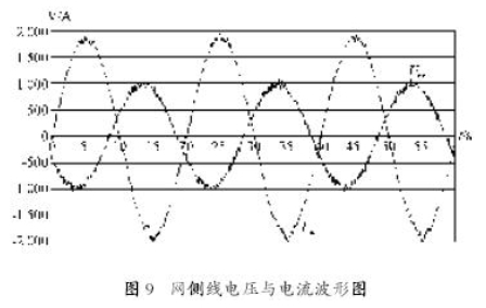 圖9 為發電機處于超同步運行(轉子轉速為1 513 r/min),給定轉矩為額定轉矩的85%,無功功率給定為零時,電網線電壓、相電流的波形圖。理論分析可知,當發電機處于超同步運行狀態,發電機的定子側和轉子側應同時向電網輸出電能,網側相電流為定子與轉子的電流之和。通常網側變流器的無功功率給定設置為零,所以定子與轉子電流的相位相同,都與電網電壓反相。實際上,由圖可知,電網相電壓與定子電流相位相差180°,完全反相,發電機處于發電狀態,向電網輸出電能,功率因數為-1。