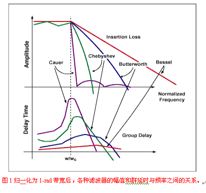 不論是用于抗混疊還是重建,濾波器都必須具備低通特性,使視頻的幀頻能夠通過。因此,設計者需要謹慎考慮AC耦合。低通濾波器可以根據其幅度特性或用于描述它的多項式來分類(Bessel、Butterworth、Chebyshev或Cauer)。圖1所示為歸一化為1-rad帶寬后這些濾波器的特性。通常應該選取具有最佳選擇性與最小極點數(降低成本)的濾波器,但是對相位線性度的額外要求限制了可選擇的范圍。