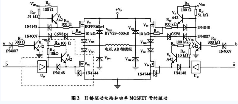 功率MOSFET管有內(nèi)接的快恢復(fù)二極管。當(dāng)不接VD11,VD12,VD13,VD14時,假定此時電機AB相繞組由VT1管(和VT4管)驅(qū)動,即VT2管(和VB)截止,VT1管(和VT4管)導(dǎo)通,電流經(jīng)VT1管流過繞組。當(dāng)下一個控制信號使VT1管關(guān)斷時,負(fù)載繞組的續(xù)流電流經(jīng)VT2的內(nèi)接快恢復(fù)二極管從地獲取。此時,VT2管的漏源電壓即是該快恢復(fù)二極管的通態(tài)壓降,為一很小的負(fù)值。當(dāng)VT1再次導(dǎo)通時,該快恢復(fù)二極管關(guān)斷,VT2的漏源電壓迅速上升,直至接近于正電源的電壓+VS,這意味著VT2漏源間要承受很高且邊沿很陡的上升電壓,該上升電壓反向加在VT2管內(nèi)的快恢復(fù)二極管兩端,會使快恢復(fù)二極管出現(xiàn)恢復(fù)效應(yīng),即有一個很大的電流流過加有反向電壓的快恢復(fù)二極管。為了抑制VT2管內(nèi)的快恢復(fù)二極管出現(xiàn)這種反向恢復(fù)效應(yīng),在圖2電路中接人了VD11,VD12,VD13,VD14。其中,反并聯(lián)快恢復(fù)二極管VD11,VD14的作用是為電機AB相繞組提供續(xù)流通路,VD12,VD13是為了使功率MOSFET管VT1,VT2內(nèi)部的快恢復(fù)二極管不流過反向電流,以保證VT1,VT2在動態(tài)工作時能起正常的開關(guān)作用。VD19,VD20,VD21,VD22的作用亦是同樣的道理。