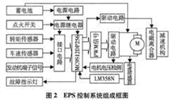 電動助力轉(zhuǎn)向系統(tǒng)的硬件電路主要包括以下模塊:MC9S12DP256微控制器、電源電路、信號處理電路、直流電機功率驅(qū)動模塊、故障診斷模塊與顯示模塊、車速傳感器、扭矩傳感器、發(fā)動機點火信號、電流及電流傳感器等接人處理電路,另外還有電磁離合器等,EPS系統(tǒng)的硬件邏輯框架如圖2所示。