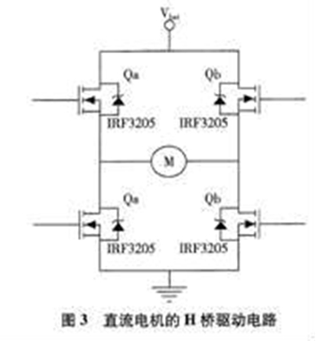 直流電動機是EPS系統(tǒng)的執(zhí)行元件,電機的控制電路在系統(tǒng)設計中有著特殊的地位。在本系統(tǒng)中采用脈寬調(diào)制(PWM)控制H橋電路實施對直流電動機的控制,由4個功率MOSFET組成,如圖3所示。采用PWM伺服控制方式,MOSFET功率管的驅(qū)動電路簡單,工作頻率高,可工作在上百千赫的開關(guān)狀態(tài)下。系統(tǒng)采用4個International Reetifier公司生產(chǎn)的IRF3205型MOSFET功率管組成H橋路的4個臂。IRF3205具有8 mΩ導通電阻、功耗小、耐壓達55V、最大直流電流110A、滿足EPS系統(tǒng)對MOSFET功率管低壓(正常工作不超過15V)大電流(額定電流30 A)的要求。