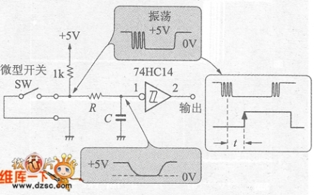 圖1的下段是R=10kΩ、C=0.1μF(T=1ms)時的輸人波形。RC低通濾波器可去掉振蕩,C的端子電壓…數(shù)字IC的輸人信號變化延遲,這一信號如果輸人到不具有施密特電路的數(shù)字IC電路中,則在閾值電壓附近易發(fā)生誤動作。照片1.8是振蕩防止電路的輸入輸出波形,從圖形中可看出確實除掉了開關(guān)處的振蕩現(xiàn)象。