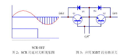 旁路開關(guān)常使用繼電器和可控硅。繼電器在中小功率的UPS 中廣泛應(yīng)用。優(yōu)點(diǎn)是控制簡單,成本低,缺點(diǎn)是繼電器有轉(zhuǎn)換時間,還有就是機(jī)電器件的壽命問題。可控硅常見于中大功率UPS 中。優(yōu)點(diǎn)是控制電流大,沒有切換時間。但缺點(diǎn)就是控制復(fù)雜,且由于可控硅的觸發(fā)工作特性,在觸發(fā)導(dǎo)通后要在反向偏置后才能關(guān)斷,這樣就會產(chǎn)生一個最大10ms 的環(huán)流電流,如圖2。如果采用IGBT,如圖3,則可以避免這個問題,使用IGBT 有控制簡單的優(yōu)點(diǎn),但成本較高。其工作原理為:當(dāng)輸入為正半周時,電流流經(jīng)Q1、D2,負(fù)半周時電流流經(jīng)D1、Q2。