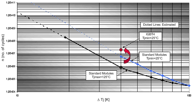 此外,如圖1所示,優化的組裝技術顯著改善了功率循環(PC)周期。這至少能確保在工作結溫增大的情況下,輸出電流增大但功率器件壽命不變——或者在相似輸出功率條件下,提高器件的使用壽命[2]。