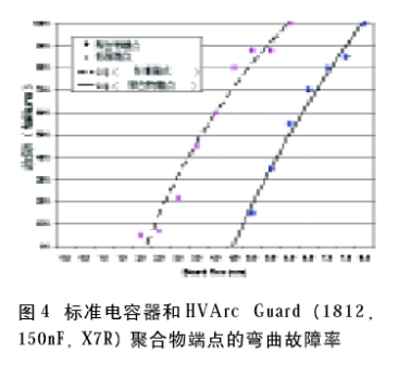 如同在前一部分中提到的那樣,焊接引線和涂層已廣泛用于生產高壓元件。除了引線外,引線框也可以用來封裝多個電容器,以得到更高的容量和增加符合性。盡管增加一個鷗翼型引線框會顯著增加元件的成本,但是它可以避免電路板彎曲的發(fā)生。直到最近,都沒有有效的方法來增加表面貼裝器件端點的符合性,但這個歷史已經一去不復返了。通過在環(huán)氧聚合物端點上加上銀,可以防止電路板彎曲時發(fā)生的故障,進而增加可靠性。這種選擇目前已用于我們的OMD-Cap范圍高壓系列設計以及HVArc Guard電容器。當電路板彎曲時,標準電容器與相同HVArc Guard電容器的聚合物端點的測試顯示的故障率差異如圖4所示。