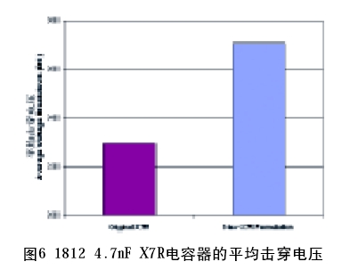 如前面敘述的那樣,有許多材料可以滿足X7R或C0G(NP0)的這類TCC要求。這些材料與各種設計的組合并不能在施加的DC電壓下以完全相同的方式實現。不同制造商任何給定電壓的可用容量一定會有很大的差異。較高的電壓可以與X 7 R 電解質中的鐵電疇(ferroelectric domain)相耦合,在元件上產生一種機械應力。這種“壓電應力”會導致電容器在z方向上若干微米的移動。當然,這是根據壓電執(zhí)行器的原理,但是在MLCC的情況下,連續(xù)的電壓尖峰會導致應力裂紋和故障。為了解決這個問題,應該使用這種具有降低壓電耦合能力的2000VDC 以上額定值的X7R電解質電容器。降低耦合系數的影響可以增加擊穿耐壓,如圖6所示。這些設計采用了完全相同的有效厚度和“浮動電極”型設計。唯一的差異在于X7R電解質的新制劑方面的修改,它可以減少與施加電壓的耦合。這種新制劑已用于我們的高壓OMD-Cap產品線。
