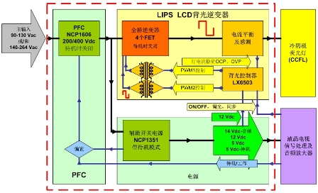 圖2:安森美半導(dǎo)體針對(duì)32英寸液晶電視的全橋高壓LIPS解決方案功能框圖。