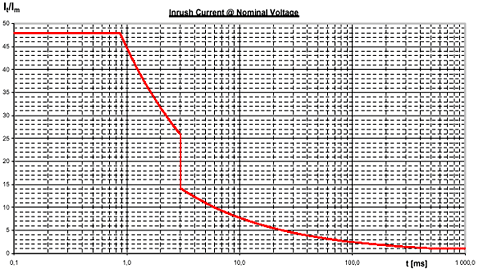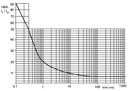 歐洲電信標準協會(the European Telecommunications Standards Institute)對用于通信系統的開關電源的沖擊電流大小做了規定,圖3為通信系統用AC/DC電源供電時的最大沖擊電流限值[4],圖4為通信系統在DC/DC電源供電,標稱輸入電壓和最大輸出負載時的最大沖擊電流限值[5]。圖中It為沖擊電流的瞬態值,Im為穩態工作電流。