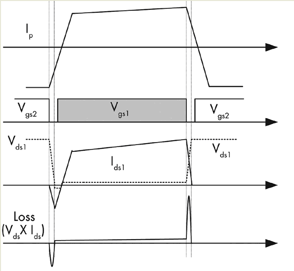 能量傳送網絡包含一個DC隔直電容和一個變壓器。這個網絡利用DC隔直電容 (CB) 消除方波電壓 (Vd) 的DC偏移,然后通過變壓器把純AC方波電壓傳送到次級端。由于存在泄漏電感,變壓器初級端電流Ip滯后于加在變壓器初級端上的電壓,這就讓MOSFET得以零電壓導通。如圖2所示,在其中一個開關斷開之后,Ip對MOSFET輸出電容進行充電 (或放電),最終開關電壓從一個輸入電軌變化到另一個 (從Vin到地或從地到Vin)。接著,Ip繼續流經反向并聯的體二極管。只要體二極管導通,相應的MOSFET就能夠零電壓導通。這種軟開關方案不僅可降低開關損耗,還能減小電磁干擾 (EMI)。