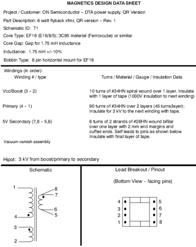 電流感測變壓器T2的設計并非最關鍵的事項,可以采用任何匝數比在30:1至50:1的小型鐵芯就可以使用。然而,主反激變壓器T1的設計對能效及優化電源性能而言非常關鍵。我們并不建議重新設計磁芯結構更小(磁芯橫截面積Ae更小)的變壓器。使用橫截面積較大的磁芯可能使總匝數較少,并有可能增量提升能效,但為了恰當的電路工作,需要維持規定的電感值。