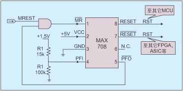需要指出的是,MAX708本身可以監(jiān)控VCC電壓(這里為5V),這對(duì)電路采用多電源模塊的設(shè)計(jì)是很有用的。因?yàn)閮蓚€(gè)電源模塊相互獨(dú)立,5V和1.5V可能不是源于同一個(gè)電源模塊,所以在監(jiān)控1.5V的同時(shí)也需要監(jiān)控5V電壓。
