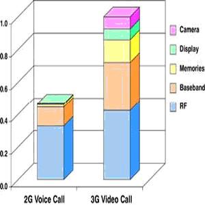 從圖一可看出,電源需求最高的兩顆零件是在射頻單元,分別是發射機的功率放大器和基頻處理器。隨著電話與基地臺之間的距離不同,功率放大器在通話過程中最多消耗75%的總功耗,待命模式則只有30%。采用非線性功率放大器的舊型GSM電話發射機的典型工作效率約為50%,但是WCDMA等較新標準卻同時需要振幅及相位調變,這只有工作效率在25%至35%之間的線性放大器可以提供。