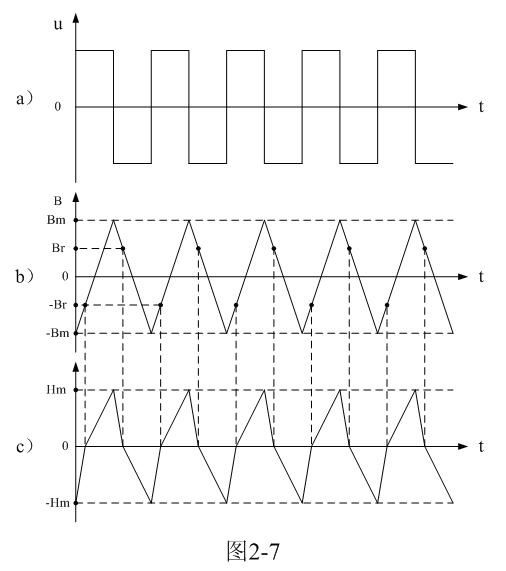 對應輸入交流脈沖電壓變化的曲線圖;圖2-7-c為變壓器鐵芯中磁場強度H對應磁通密度B或磁通