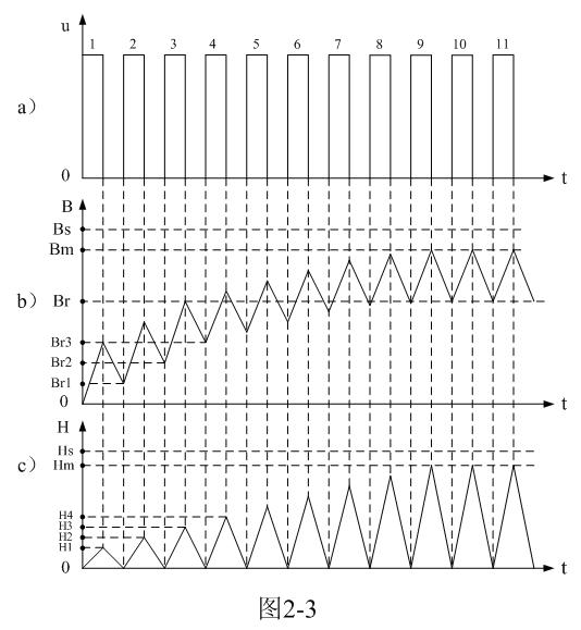 從圖2-7-a)和圖2-7-b)可以看出,每輸入一個交流脈沖電壓,變壓器鐵芯中的磁通密度B或磁通 就要線性增長和下降一次,磁通密度變化的范圍是從負的最大值-Bm到正的最大值Bm,并且增長和下降的速率基本一樣。從圖2-7-c)可以看出,每輸入一個交流脈沖電壓,變壓器鐵芯中的磁場強度H也要增長和下降一次,但增長和下降的速率卻不一樣;增長的速度慢,而下降的速度快,這是因為變壓器初、次線圈產生的反電動勢與輸入電壓同時對變壓器鐵芯進行退磁的原因。