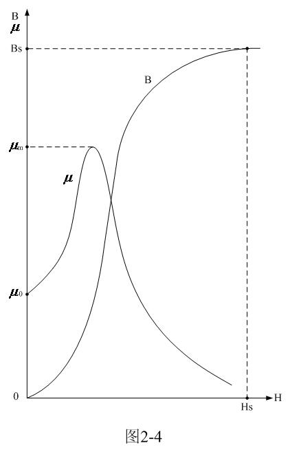 在圖2-4中,曲線B為磁通密度對應磁場強度變化的關系曲線,曲線 為導磁率對應磁場強度變化的關系曲線。由于我們這里把磁場強度作為自變量,而磁通密度和鐵芯導磁率都作為因變量,因此,我們同樣可以把曲線B和曲線 統稱為變壓器鐵芯的磁化曲線。