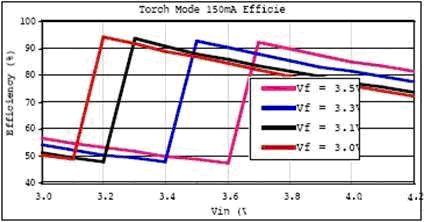 圖4、5分別是SP6686在150mA電筒模式和400mA閃光模式時的效率曲線: