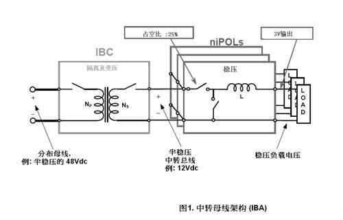 IBA的理念是把母線電壓降至一個稍稍高于負載點的電壓,再由較便宜的降壓器(niPoL)來完成余下的工作。降壓器(niPoL)經由電感器傳輸電壓到負載,這電壓相等于上開關和下開關共同端電壓的平均值,等如上開關電壓占空比與中轉母線的乘積。