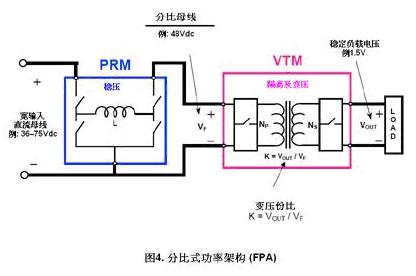 分比式功率架構把DC-DC轉換器的功能重新編排;并以晶片封裝的元件來實現。它的主要元件是預穩壓模塊(PRM)和電壓轉變模塊(VTM)。PRM只有穩壓功能,VTM具變壓和隔離功能,PRM和VTM合起來,就能實現DC-DC轉換器的功能。