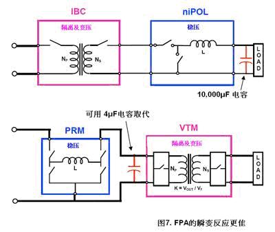 FPA的瞬變反應較IBA理想。如前述,IBA把電感器放在中轉母線與負載之間,產生電流慣性。在FPA分比母線與負載之間沒有電感器(圖6),由于VTM不受電感慣性左右,可快速的反應負載變化。在分比母線的電容由于沒有電感的阻隔,可對負載有效旁路,該電容相等于在負載加上1/K2倍電容值,這便無須在負載點加上大電容。圖7清楚表示在FPA只需用上4uF的電容便可以取代IBA中的10000uF電容。