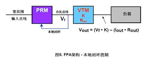 本地閉環(圖8)是最簡單的方法。PRM感應它自己的輸出電壓,再調整及維持分比母線電壓在一個常數。負載電壓按VTM的輸出阻抗的比例升降(VfK-IoutRout)。一個PRM可同時連接多個VTM。