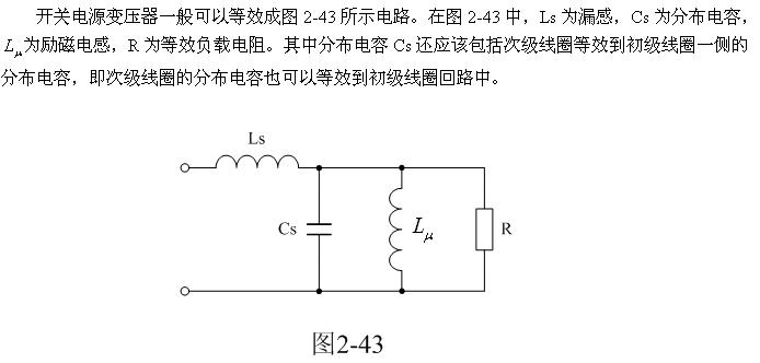 這里順便指出,圖2-45-b的波形是很難測(cè)量到的,因?yàn)樗旧隙荚谧儔浩鲀?nèi)部的分布電感Ls與分布電容Cs之間產(chǎn)生,但它會(huì)通過(guò)輻射對(duì)周邊電路造成干擾。
