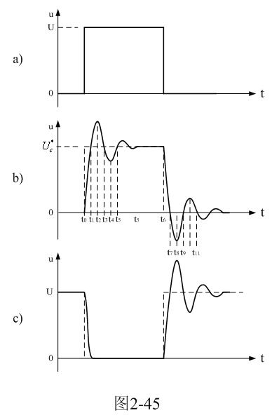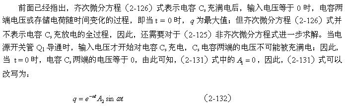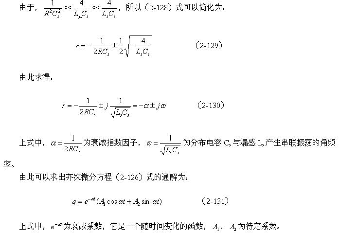 當(dāng)開(kāi)關(guān)管Q1導(dǎo)通過(guò)后,開(kāi)關(guān)管開(kāi)始關(guān)斷,相當(dāng)于輸入脈沖電壓的上升率為負(fù)(脈沖進(jìn)入反沖階段),此時(shí),輸入脈沖電壓的上升率小于串聯(lián)振蕩回路自由振蕩電壓的上升率,因此,振蕩回路又開(kāi)始再次釋放能量,振蕩回路再次產(chǎn)生阻尼振蕩,如圖2-45所示。