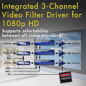 飛兆半導體擁有業界最廣泛的精選視頻濾波器和創新的開關矩陣產品系列,支持標清和高清視頻應用如機頂盒、DVD、電視和便攜式多媒體設備。這些集成式產品支持全部視頻標準和信道配置,并可替代多個分立組件和節省寶貴的電路板空間。FMS6303采用14腳TSSOP封裝,其引腳與飛兆半導體成功的FMS6203可選SD、ED、1080i HD視頻濾波器兼容。