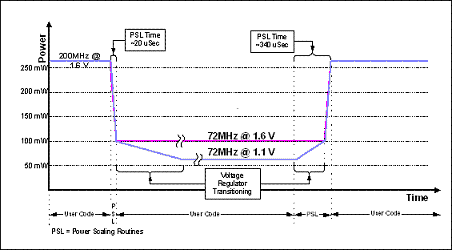 我們不妨假設DSP正在運行非常復雜的算法。通常說來,內核電壓為1.6V,頻率為200MHz,如圖2中左側藍線所示。不過,當未運行算法時,我們可用功率調整程序庫將頻率降至72MHz。
